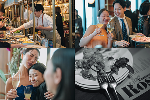 2人がパーティ会場に選んでいたのは、ホテル内の王道イタリアン。私の頭に浮かんだのは、立ち飲みで気軽に料理を少しずつつまむイタリアのワインバー文化〈バーカロ〉でした。結婚式ではなく「ウエディングバーカロへの招待」と謳えば、立食スタイルも楽しみに変えていただけそう!