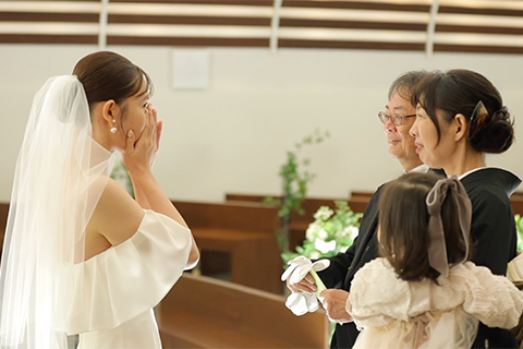 ひと掘りの時間をたくさん作ったことで、いつしか2人は気持ちを具体的に伝えてくれるようになりました。そんな中、新婦が「両親に手紙を読みたい」と希望。血の繋がらないお父様への思春期の反抗的な態度を謝り、「お父さん」と呼びたい、と話してくれたのです。両親と向き合う姿を、悩んだ時支えてくれた友人にも見てもらいたい。でも新郎側のゲストには聞かれたくない、と語る新婦。挙式後、新婦側のゲストにはチャペルに残ってもらい、そこで手紙を読むことに。新郎側のゲストはセレモニーを行うガーデンへ先に案内し、新郎も一緒に過ごしてもらうことで、それぞれに配慮したスムーズな動線を作りました。直前に新婦から、手紙を読む主旨について私から説明してほしいと頼まれましたが、「まっすぐな気持ちを受け止めてもらうための時間です。頑張りましょう。そばにいます!」と笑顔で握手。無事、その想いをお父様にも友人にも届けることができました。